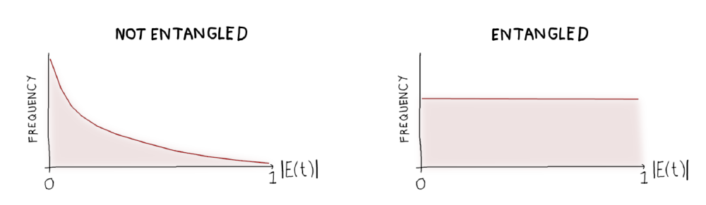Ah, these look pretty different! If we just look at the average value of $abs(E(t))$ over time, we can very easily spot the difference between any product state and any maximally entangled state. In fact: